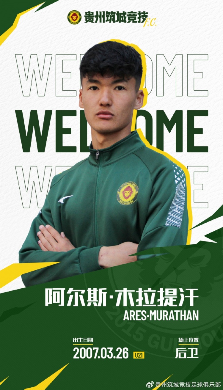 经与球员协商一致,阿尔斯-木拉提汗正式加盟贵州筑城竞技足球俱乐部。阿尔斯-木拉提汗2007年3月26日出生于新疆乌鲁木齐,身高192cm,体重80kg,司职中后卫。