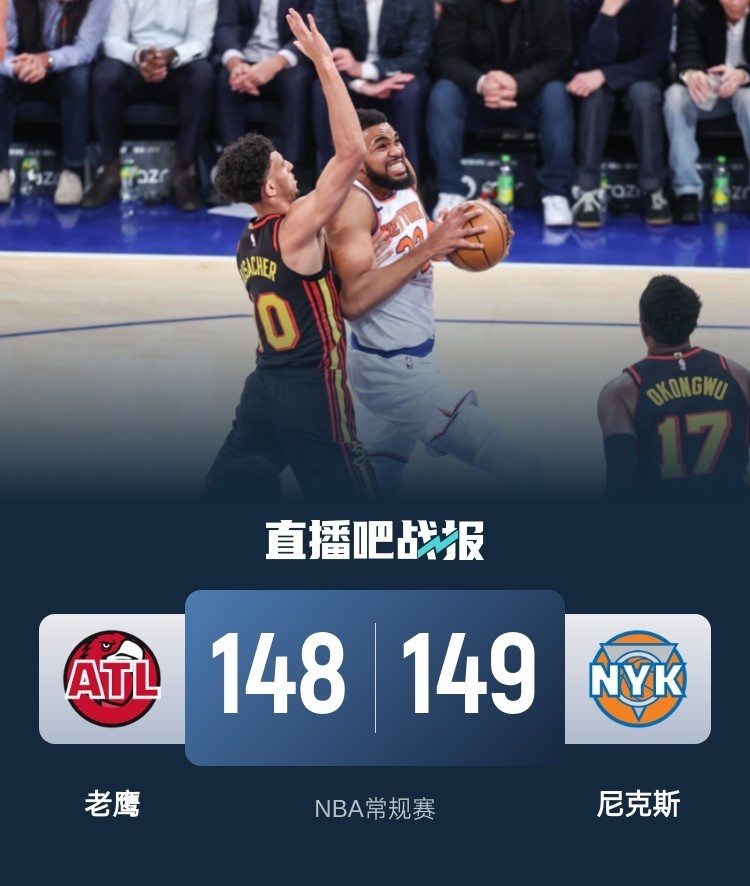 布伦森准绝杀36+8 唐斯44+10 杨38+19 尼克斯加时险胜老鹰
